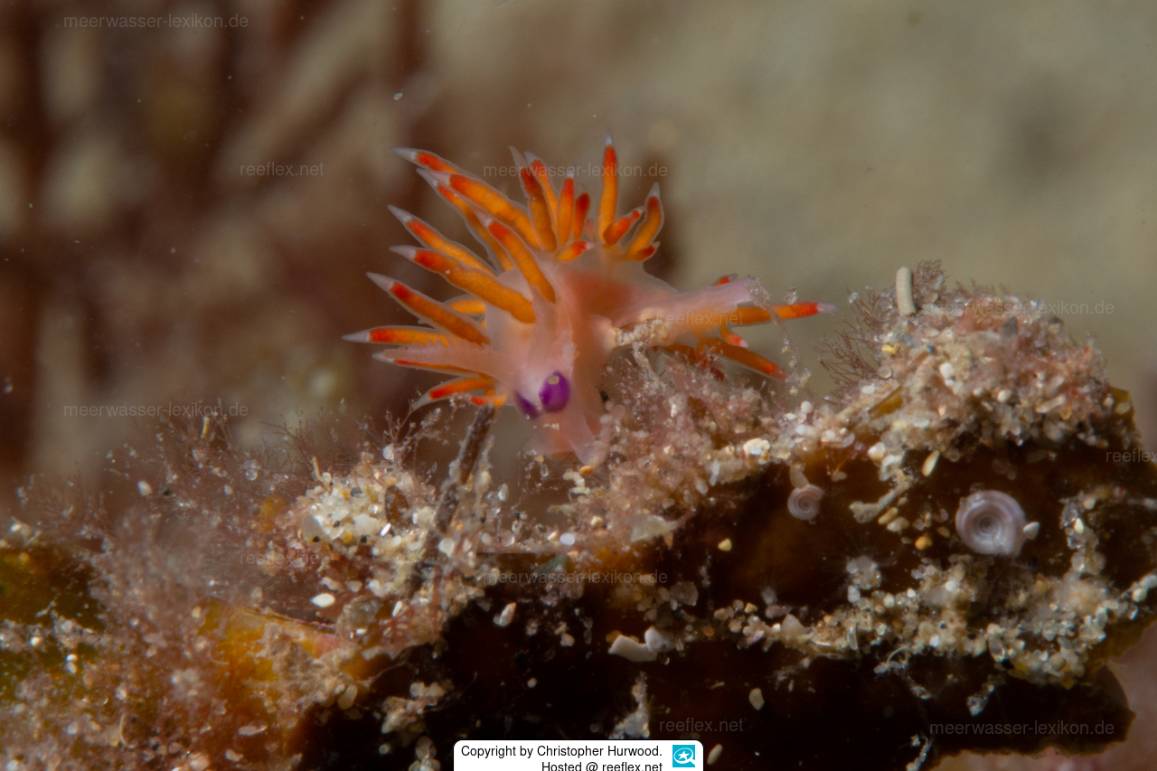 The cerata with a deep orange-red band, digestive gland duct is usually orange or yellow. The body colour is translucent clear sometimes with a purplish tinge. The upper half of the rhinophores have papillae on the posterior side, though these can be absent in juveniles.