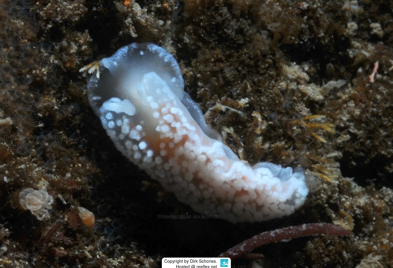 The body of Curnon granulosa is translucent white with branches of the pink digestive gland showing through the skin. The mantle is bordered by an opaque white band and the dorsal surface is covered by pointed tubercles which are tipped with white pigment.Rhinophores are translucent and white tipped.