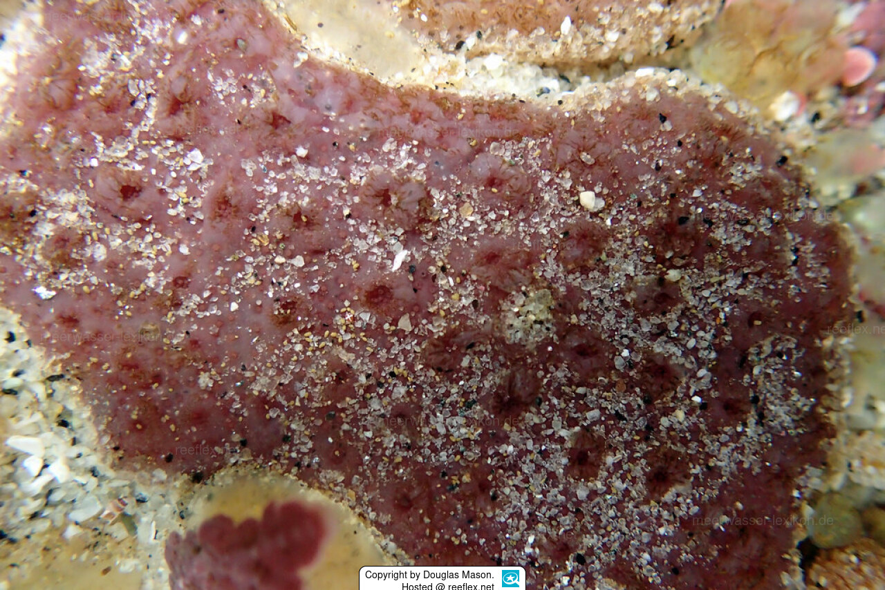 Common known as Sand Ascidian. Colony is thick and firm with embedded sand grains. Color variabel: brown, purple, reddish orange.