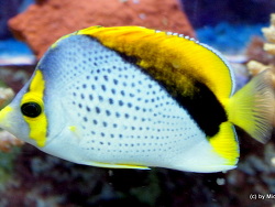 The Marquesan Butterflyfish has beautiful orange coloration covering the dorsal half of the body, as well as a small orange mask covering the eyes. The bigger part of the body are white with black spots.