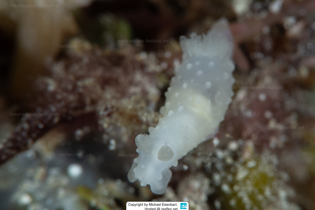 Gymnodoris tuberculosa is uniformly translucent whitish with small rounded whitish tubercles. The gills form a complete circle.Rhinophores are lamellate and translucent white to cream or pale yellow in colour.This species is nocturnal.