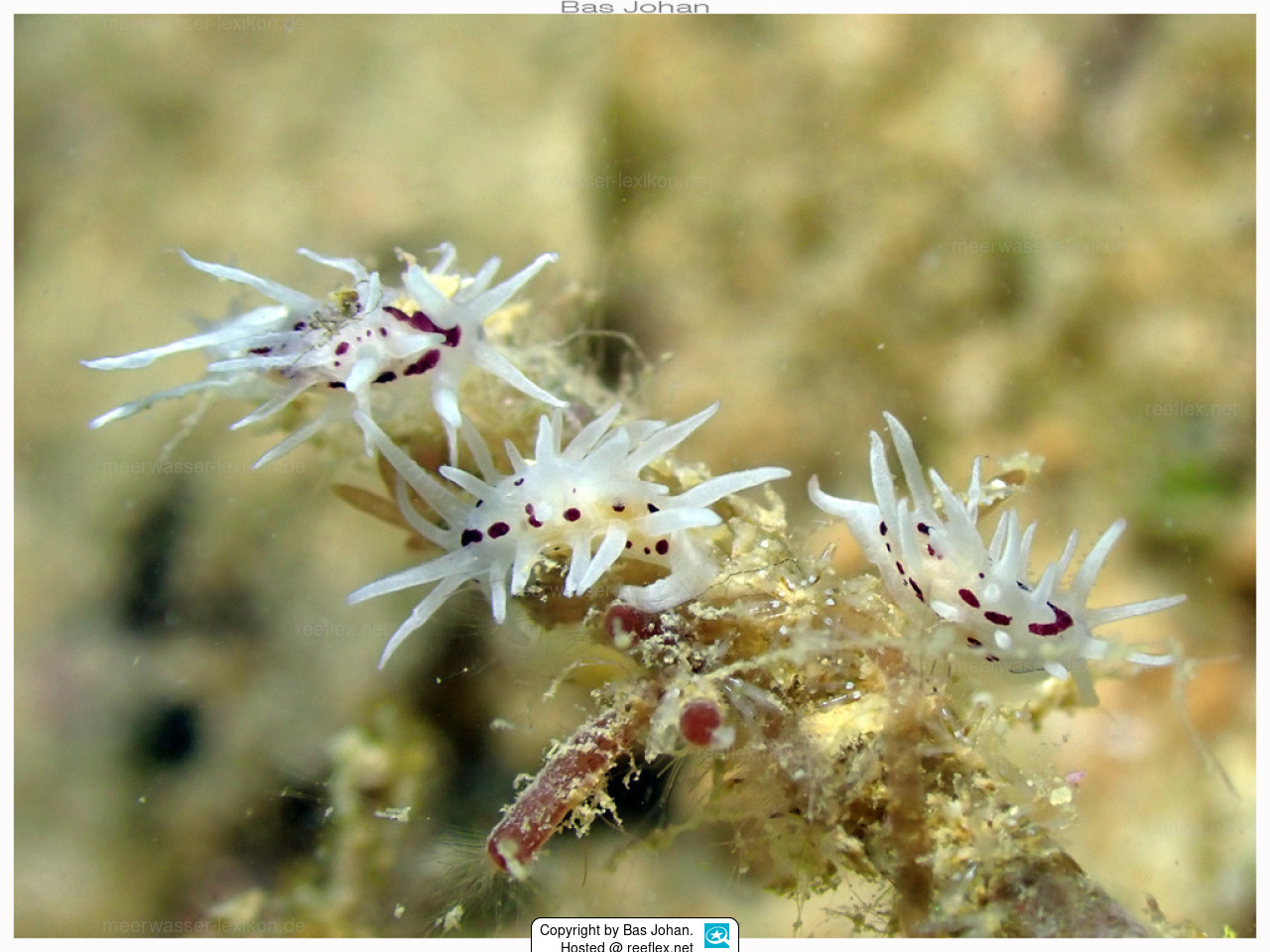 The body of this tiny nudibranch is translucent white with irregular chocolate brown spots.