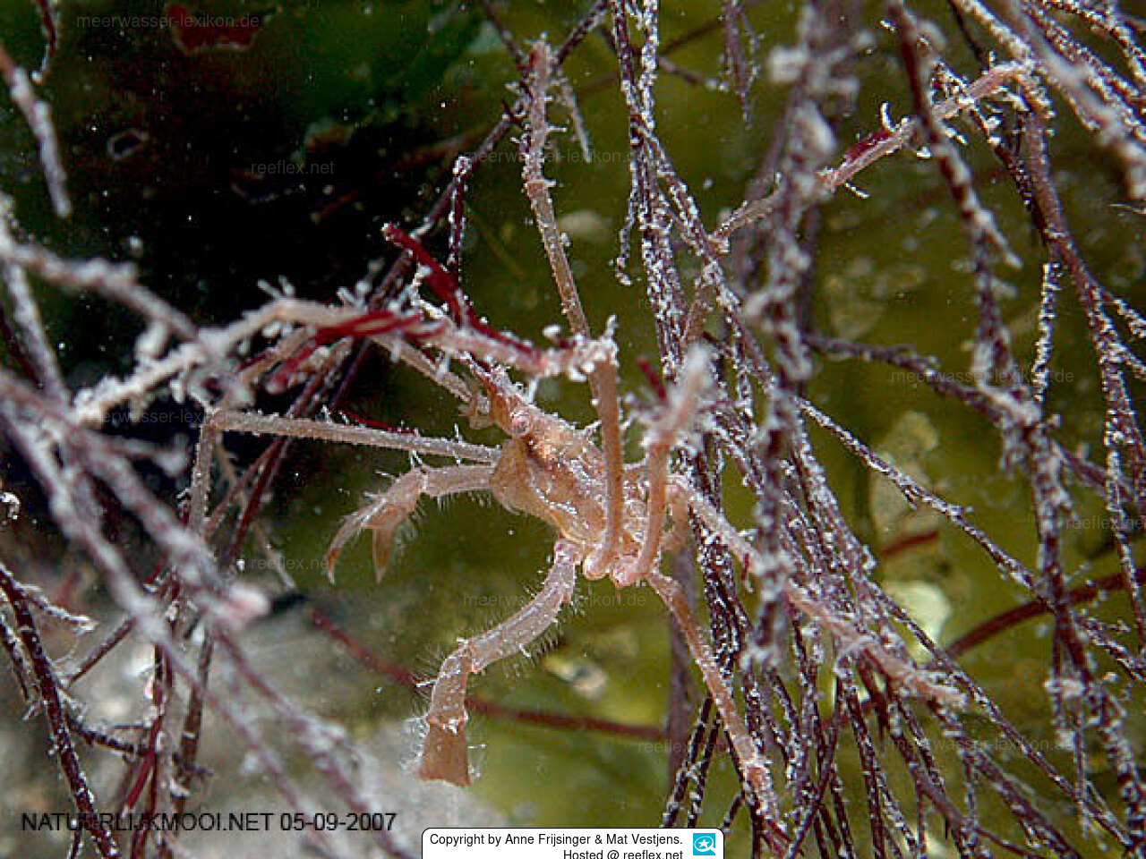 Die langbeinigen Krabben sind oft von Algen, Hydrozoon und Schwämmen bewachsen.