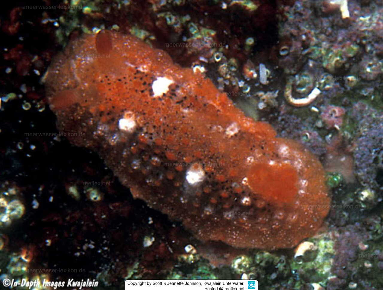 The background colour is translucent to a deep orange. On the mantle are white patches, small blackish spots and relatively large rounded, often capped,deep orange tubercles. The largest tubercles are often white.