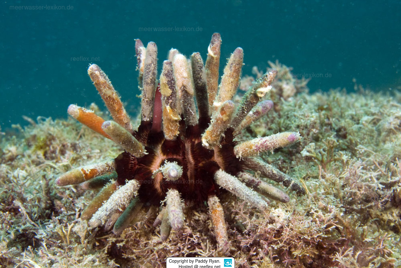 The colour is brown to very dark purple. Spins to 16 cm long and often encrusted with sponges,hydrozoa, bryozoans, tube worms and algae.